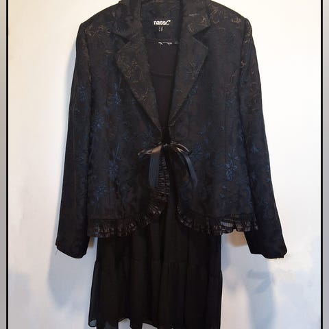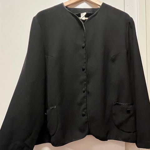 Erikoinen, kaunis musta jakku, jota vain vähän pidetty. Ka-ka n. 50 cm, pituus n. 75 cm. 50 % polyesteriä ja 50 % viskoosia. Siisti upea matkavaate vaikka edustustilaisuuksiin tai hautajaisiin erikoisten nappiensa vuoksi.