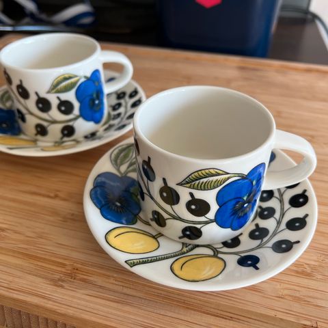 Iittala Paratiisi kahvikuppi ja lautaset, joissa on värikäs kukka- ja hedelmäkuviointi. Sarja sisältää kahvikupin, pienen lautasen ja suuremman lautasen. Astiat ovat valmistettu kestävästä posliinista.