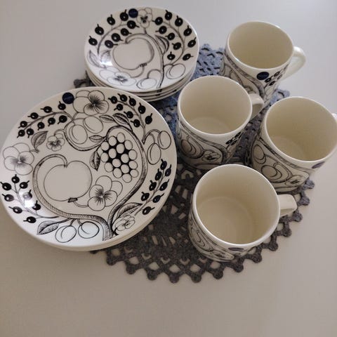 Iittala Paratiisi mustavalkoinen 8 kpl isompi kuppi ja 9 kpl lautaset
