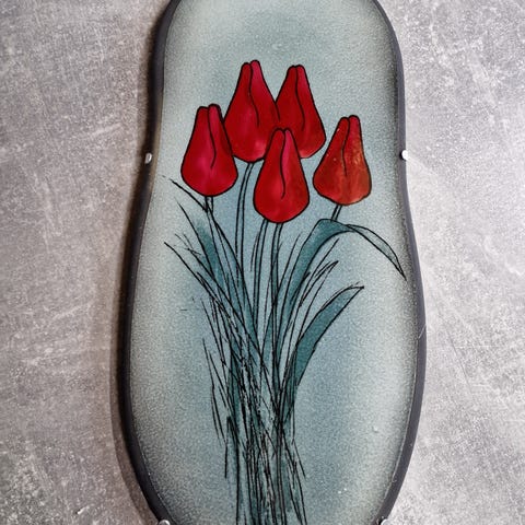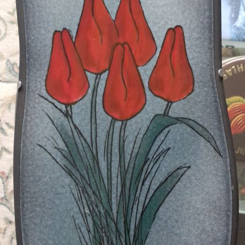 Heljä Liukko-Sundströmin Arabialle suunnittelema Tulppaaneja tulvillaan seinälaatta 1990-luvulta. Laatta on signeerattu. Mukana ei tule ripustinta. Pidetty vitriinikaapissa ns. lautaspidikkeellä joka ei sisälly kauppaan. Mitat: korkeus 32 cm, leveys 13,5 cm.