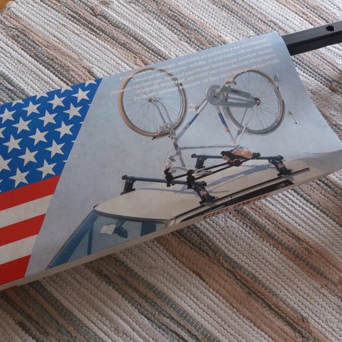 Vanhempi, mutta vain muutaman kerran käytetty kattotelineisiin kiinnitettävä pyöräteline.