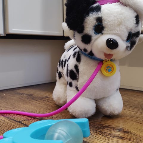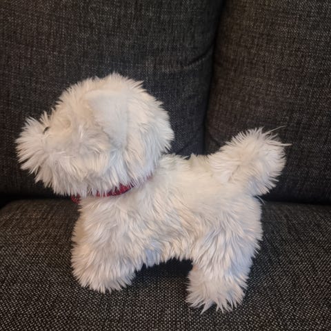 Valkoinen moottoroitu pörröinen lelukoira. Koira toimii isoilla pattereilla. Patterit pitää uusia tähän koiraan. En kokeillut uusilla pattereilla, että mitä koira tekee. Luulen, että tämä koira haukkuu ja kävelee. Ulkoisesti on ehjä söpö pörröinen koira. Jotain pieniä kellertäviä tahroja on vähän karvoissa. Tätä en ole pessyt, kun ei viitsi koneeseen laittaa sisällä olevan moottorin takia. Liat saattaa lähteäkin pois, jos haluaa yrittää putsata. Rätillä kannattaisi koittaa putsata mikäli sen katsoo tarpeelliseksi. Kiva koira leluna tai ihan vaan koristeena hyllyllä. Koira haukkuu päätä heiluttamalla ihan ilman pattereitakin. Kiva lelu jollekin pienelle koirafanille.