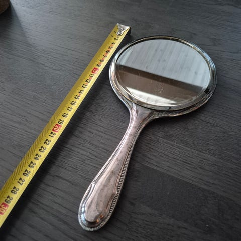Pieni peili / taskupeili 80-luvulta. Jonkin verran ajan tuomaa kulumaa. Peilissä ei ole viivoja, heijastuu katosta.