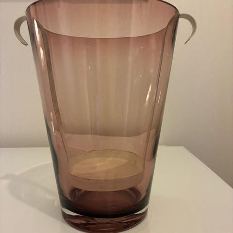 Myydään Pentikin sininen maljakko, säilytetty vitriinissä.