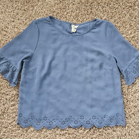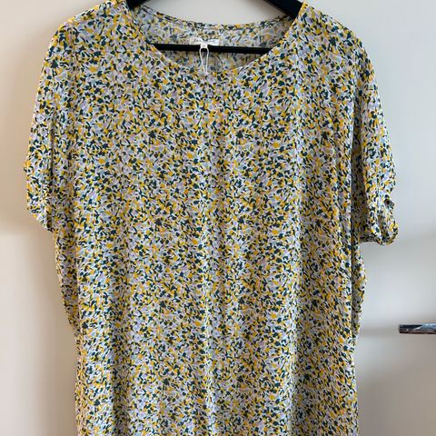 Sininen pilkullinen ohut pusero. Edessä lyhyt napitus, hihoissa sisällä lenksut, joilla saa käärityt hihat pysymään ylhäällä. Materiaali 100 % viskoosia. Mitat kainalosta kainaloon 48 cm ja olkapäästä helmaan 62 cm. Postitus tai nouto Tammelasta.