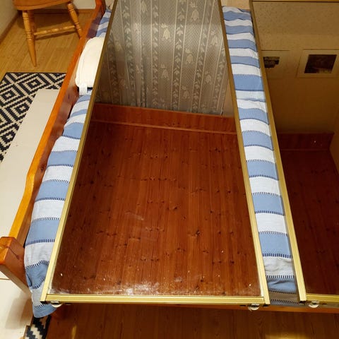 Vaatekaappiin asennettava ulos vedettävä ja kääntyvä peili. Valmistaja Hettich. Peilin mitat: 305 x 1155 mm. Asennusohjeet ja tarvikkeet mukana.