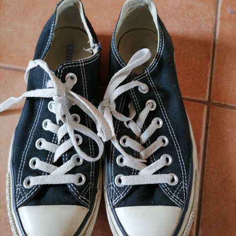 Hyväkuntoiset mustat tennarit, päällinen nahkaa. Aika kapea malli.Star kengät, ehjät ja vuori kangasta, joka myös on täysin ehjä. Hinta 2 euroa.