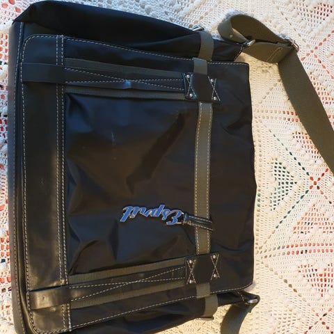 Olkahihnan pituus säädettävissä. Pohjan koko n. 15x22 cm ja korkeus 26 cm. Sisäpuolella kaksi taskua, toinen avoin ja toinen vetskarilla. Yläreunassa vähän kulumaa, muuten siisti.