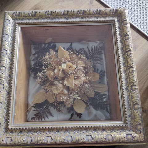 Kauniissa puukehyksessä hääpäivät, sinisellä pohjalla kultainen teksti. Valkoisessa kehyksessä käsintehty kultaraita ja mattalasi.