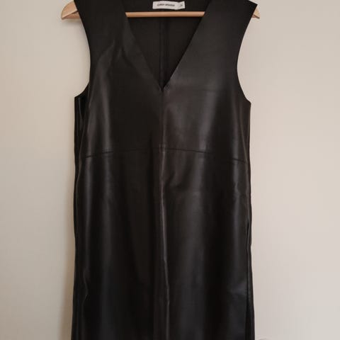 Uusi tekonahkamekko sifonkimekko. Yläosa sifonkia ja alaosa tekonahkaa. Yläosan sifongista irronnut nappeja ja ne valitettavasti hukassa. Koko noin 38