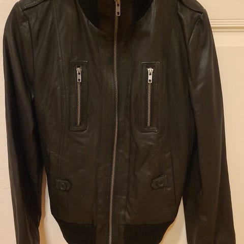 Myydään Onlyn tekomokkanahkatakki. Koko 34, väri oliivinvihreä. Biker-mallinen. 100 % polyesteri. Konepesu 30 asteessa.