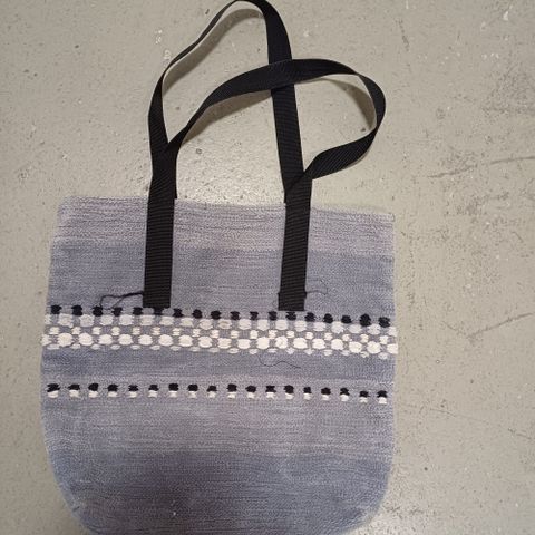 Punottu raidallinen laukku, jonka mitat 9x20cm. Sopiva moneen käyttöön.