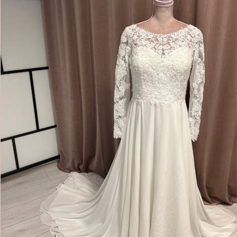 Puku on koossa 18. Lyhennetty 172 cm pitkälle morsiamelle ja kavennettu hieman sopimaan yläkroppaan. Sanoisin yläosan olevan kokoa m ja alaosan l. Kaikki muokkaukset purettavissa. Muokkaukset ompelijalla teetetty.