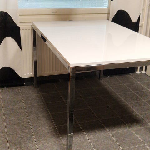 Maitolasi & metallijalat. Voi myös käyttää 6 henkilön ruokapöytänä. Pientä käytön jälkeä on.