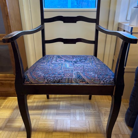 6 kpl keittiön tuoleja suoraan käytöstä. Itse joskus päällystetty mustalla kankaalla (kangas osin rispaantunut). Alla alkuperäinen beigen värinen kangas. Vatinee pesua.