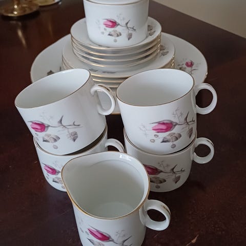Sirot, käsinkoristellut, kultareunaiset, kiiltävät kahvikupit aluslautasineen 6 kpl. Väritys on vihertävän/harmaakiiltoinen. Mukaan myös sokerikko, kermakko ja 2 pullalautasta. Yhteensä 16 osaa! Nouto tai toridiili.