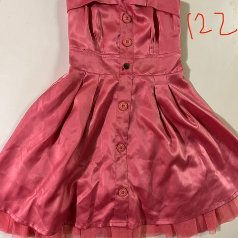 Myydään siisti, ehjä ja hyväkuntoinen samettimekko, koko 128. 75% puuvilla, 25% polyesteri.