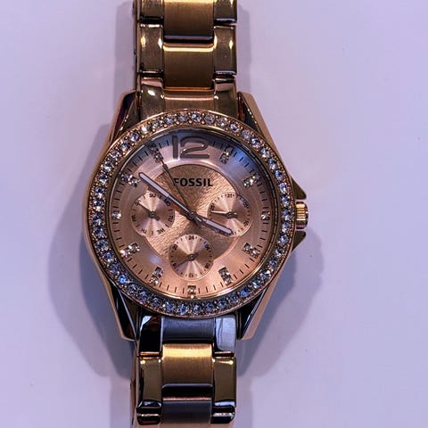 Tämä ei ole fossiileille vaan Teille auringossa ja etenkin illan hämärässä viilettäville ikinuorille! Käyttämätön, timantein (fakes) koristeltu kello on nyt myynnissä huimasti edullisemmin kuin tunnetun Fossil brändin verkkosivulta. Hallituksen puheenjohtajan lahjaksi saama kello ei ole sopinut hänen asukokonaisuuksiinsa, joten täältä löytyy varmasti sopiva ranne ja kelloa arvostava uusi omistaja. Timantit ovat ikuisia ja nämäkin lähes. Hinta on 60 Euroa.