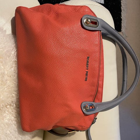 Käsilaukku, nahkaa, niiteillä, ostettu Pariisista, koko 24x30ja pohjan leveys 12 cm. Merkki Devernois. Mukana dustbag.