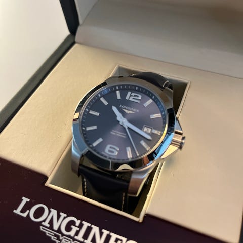 Hienokuntoinen sveitsiläinen automaattikello, malli L1.645.4.52.4, koneisto L633. Upea musta kellotaulu, jossa päivyri sekä itsevalaisevat tuntimerkinnät ja viisarit. Naarmuuntumaton safiirilasi. Ruostumattoman teräsrungon halkaisija 40mm. Käy moitteettomasti, käyntivara 38 tuntia. Uusi musta nahkaranneke Longineksen soljella. Mukaan paperit ja alkuperäinen hieno jalopuinen säilytyslaatikko.