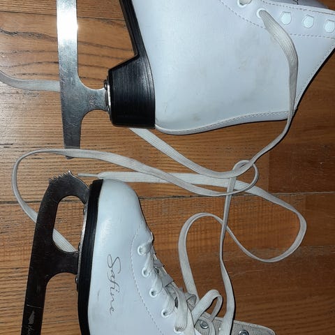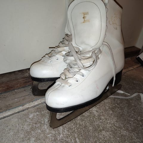 Sari-merkkiset kaunoluistimet kokoa 37. Toisen luistimen nauhareunassa pieni halsti (kuva) ja kärjissä jälkiä. Parissa kohtaa peitetty nimikoinnit. Ilman nauhoja.