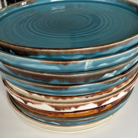 Soppa-; ruoka- lautaset ja kastike purkit.