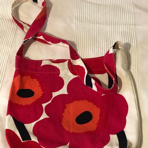 Käyttämätön Marimekon Unikko olkalaukku, säädettävä hihna, sisällä 2 isoa taskua, keskellä vetoketjytasku ja takana pieni vetoketjutasku, magneettinen nekkari kiinnitys läpässä. K 30 L 30 S 11 (joustaa). Kukan väri oliviinvihreä.