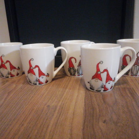 Kuppi / muki / kahvimuki, joka on valkoinen ja jossa on tonttujen kuvia. Hyvässä kunnossa.