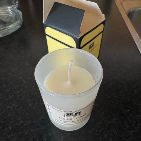 Käyttämätön vaaleanpuna-lilahtava (pinkki) Glade lasinen tuoksukynttilä. Noin 7cm korkeus ja 7cm halkaisija.