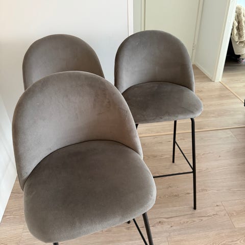 Kaksi harmaata pehmustettua baarituolia, istuinkorkeus n. 80 cm.