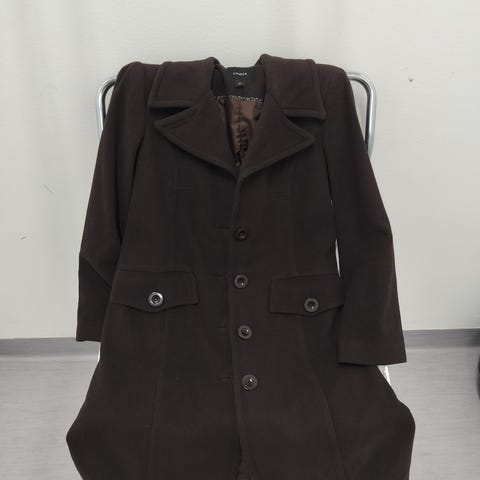 Tummansininen naisten villakangastakki. Koko on S. Mielestäni menee vielä s/m kokoiselle, joten aavistuksen isompaa kokoa on. Edessä vetoketju ja muutama painonappi, sivuilla avotaskut.