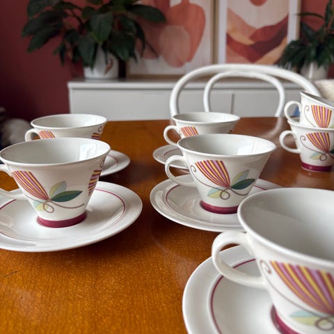 Arabian Harlekin -kahvikuppisetti (kahvikuppi + aluslautanen) sekä valkoinen kakkulautanen (ei ole Arabian). Settejä on 12 kpl. Myydään kaikki yhdessä.