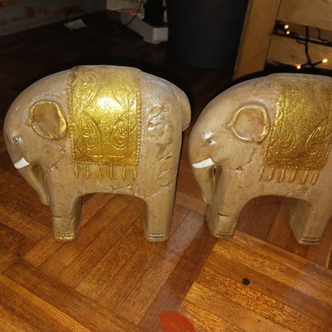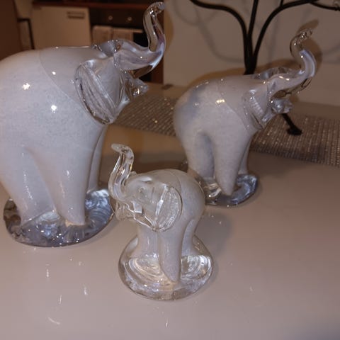 Kolme sisustusnorsua. Korkein lasinen (Lasi-Kostamo), seuraava puinen ja pienin savea. Kaikki samaan kotiin. Mahdolliset postituskulut ostajalle.
