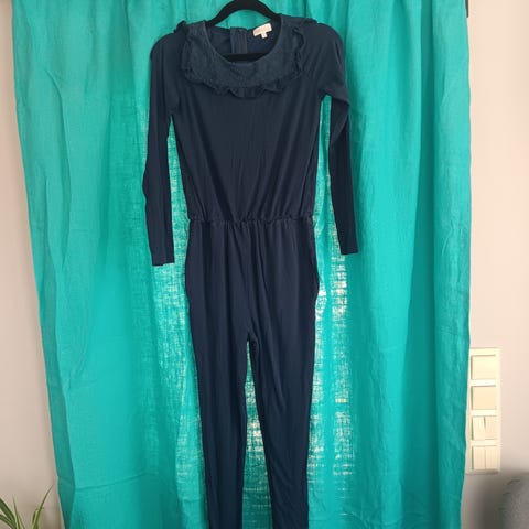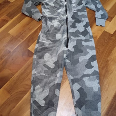 Myydään harmaa-violetti jumpsuit, collegekangasta, koko 134/140.