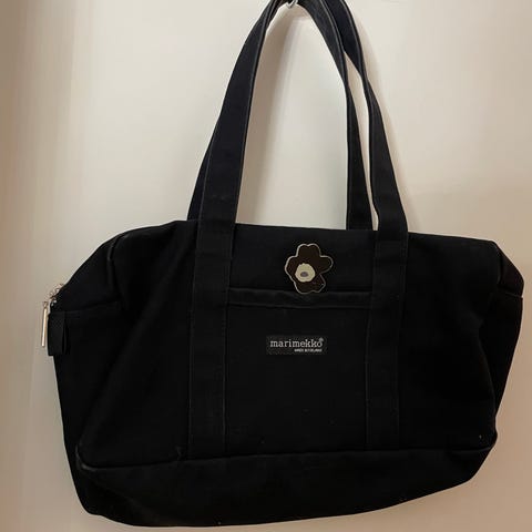 Marimekon uniikki heppalaukku. Voi kääntää. Kanvaasia. Mustalla pohjalla valkoisia hevosia. Kassin suun saa nepparilla puenemmäksi. Hyvä kantaa ololla. Ei pesty. Pientä kulumaa yhdessä kulmassa. Mitat riippuu siitä miten mittaa: Leveys venytettunä täysin litteäksi. 44 cm tai 35 cm jos päätyihin jää laukun syvyys. Korkeus n. 26 cm.
