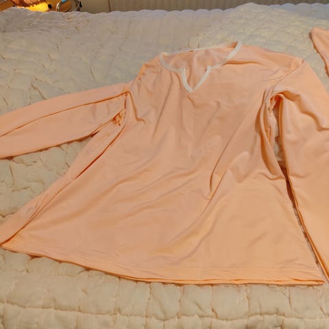 Viininpunainen yöpuku polyesterisatiinia. Puvun nurjapuoli on puuvillaa. Kangas on tavallista polyesterisatiinia paksumpaa ja puku on aika lämmin. Takki on aika väljä ja sopisi L-kokoisellekin. Housujen lantionympärysmitta on 96 cm. Pitkät lahkeet. Puku ei ole ollut käytössä. En käytä ToriDiilia. Postikulut 5€.