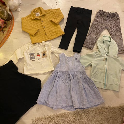 Palmikkoneule 100% puuvillaa, merinovillainen aluspaita ja Espritin vuoritetut ulkohousut. Kaikki ehjiä ja siistejä.