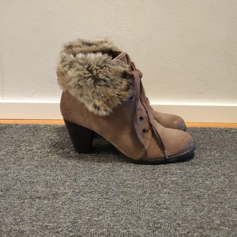 Jonkun verran käytetyt kengät. Koko 38. Toisessa kantapäässä pieni jälki, näkyy kuvissa
