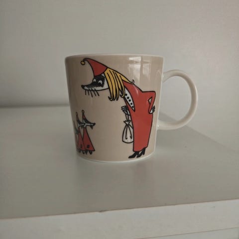 Myynnissä kuvan mukainen muumimuki. Ei tarraa. Kunto hyvähkö. Sisäpuolella pohjassa pientä jälkeä käytöstä. Ei halkemia tms.