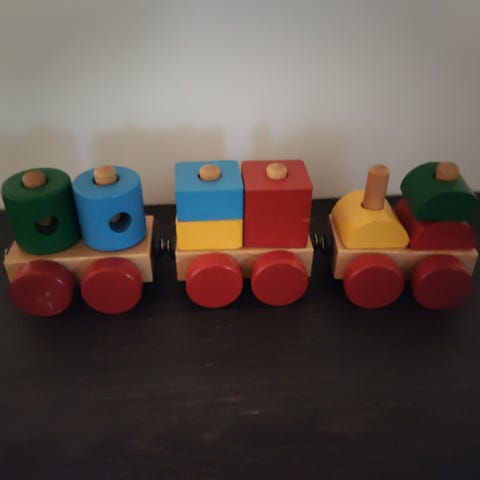 Puinen siisti ja hyväkuntoinen juna 54cm pitkä ,ja värilliset puiset palikat 33kpl.
