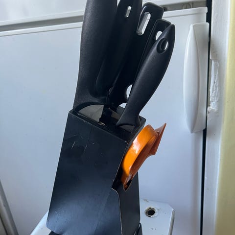 Moniosainen setti esim perunoiden pilkkomista varten. Näppärä laite, jolla yhdellä painalluksella saat kerralla pilkottua yhden kasviksen/juureksen jne pienemmäksi.