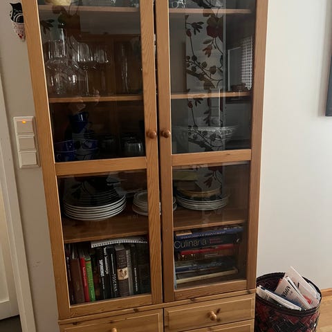 Myydään hyvä kuntoinen vitriinikaappi. Lasihyllyt irrotettavissa. Mitat : kork 139x lev 140 xsyv 45cm.