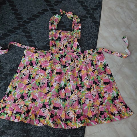 Vintage vartaloesiliina käyttämätön. Nauhoineen pituus 160 cm Essun pituus 38 cm. Itse tehty puuvillakankaasta, kanttaus viininpunainen nauha. Mallin vuoksi suojaa koko ainakin kolo etupuolen, helmaa 140 cm! Hinta 2 euroa