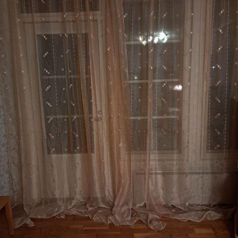 Myydään kuvan ikkuna verhot, joissa yläosa ja kaksi alaosaa.