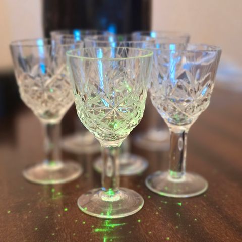 6kpl kristallilaseja ja saman sarjan kannu. Näitä myytiin joskus kultasepänliikkeessä. Kanta vihreä ja varsi sinisen ja kullan värinen. Laseissa kaunis pystyviivahionta mikä ei erotu kuvissa. Lasin korkeus 17cm ja suuaukko 8cm. Kannu 25cm. Marginaalinen korkeusero laseissa mikä on ollut kristallilaseille tyypillistä. Aavistus kultauksissa puutetta kannassa. Ei säröjä tai lohkeamia. Nouto Saimaanharjulta 10km Lappeenrannasta. Voin postittaa jos löytyy sopiva laatikko