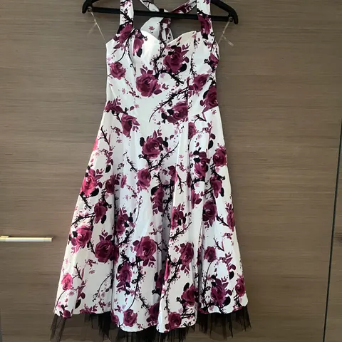 Upea tumma vihreä satiinia mustalla aluhamella, koristeltu rusetti nauhalla.mekon pituus olkaa päästä helmaan noin 135cm.