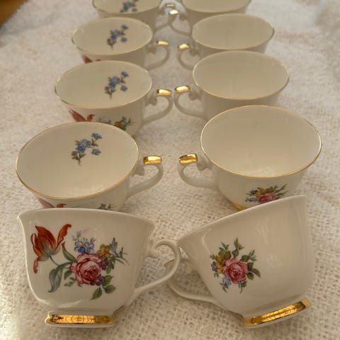 Myydään lähinnä koristeena olleet ja erittäin hyväkuntoiset Arabian Kulta-aika -sarjan kahvikupit tasseineen ja pullalautasineen. Jäljellä vielä numeroidut yksilöt: 1-5, 7 ja 10, eli yhteensä 7 settiä.