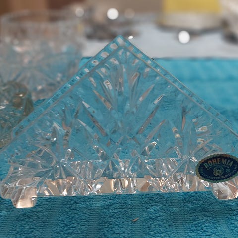 Upea juhlakattaukseen sopiva servettiteline. Aitoa käsinhiottua Bohemia kristallia. Uusi, käyttämätön. Alkuperäispakkauksessa. Otettu paketistaan vain kuvausta varten. Valmistusmaa: Tsekki. Mitat: Korkeus 9,5 cm, leveys 14 cm. Savuton ja eläimetön koti. Postitus onnistuu.