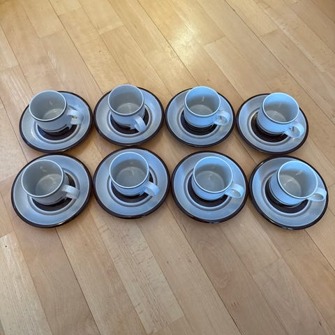 Käyttämättömiä Arabian Pirtti kuppeja (6×6,5cm) 20kpl ja lautasia (14cm) 25kpl. Kuppi & lautanen = 5.