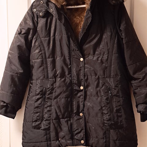 Musta uudenveroinen hupullinen talvitakki,vähän käytetty. Vetoketjulla ja neppareilla